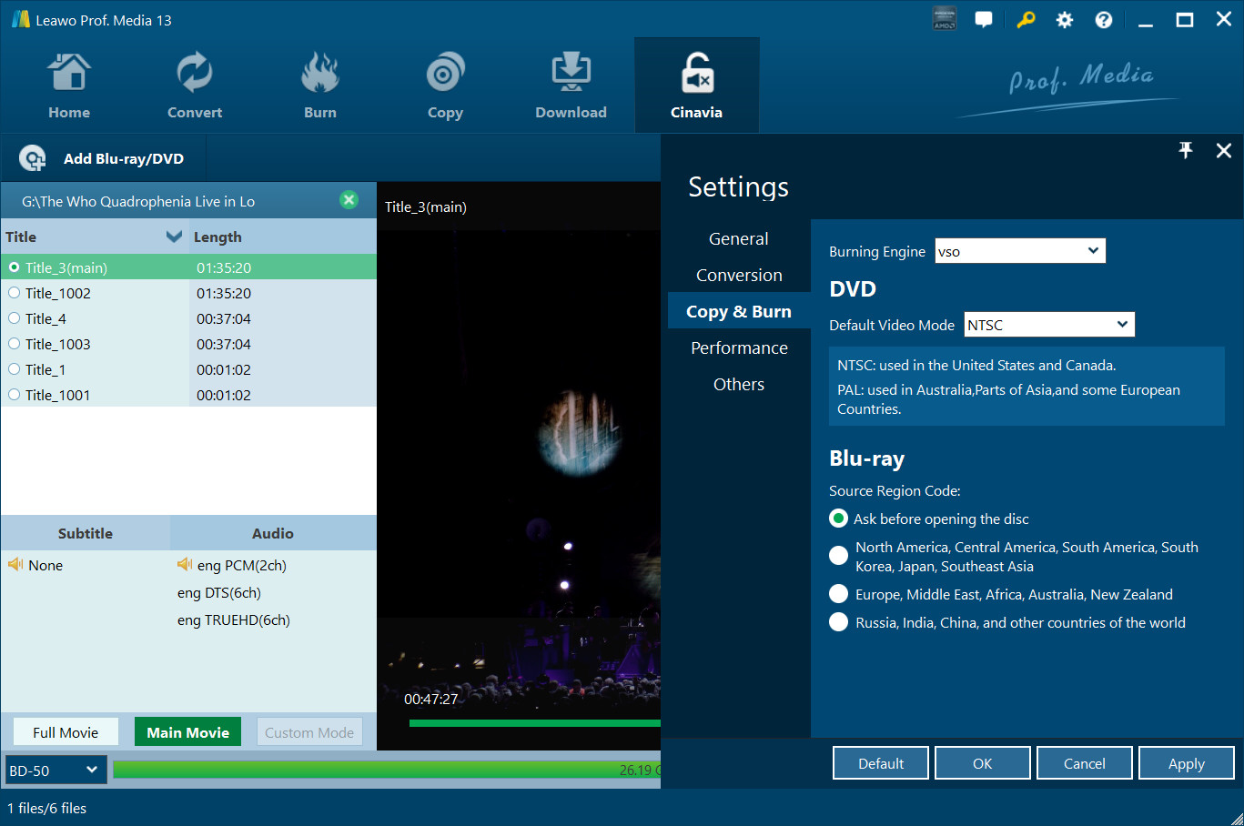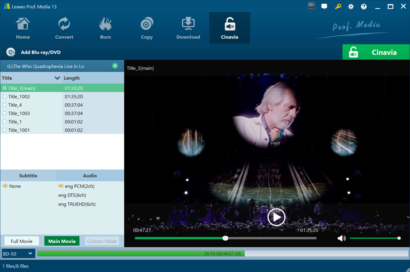 关于 Cinavia 保护, Leawo Blu-ray Cinavia Removal 可以帮助您摆脱 Cinavia 限制,让您获得无 Cinavia 的蓝光文件副本。它足够强大,可以处理蓝光电影的 Cinavia 和其他限制。您无需使用其他蓝光解码工具来转换带有其他复制或播放限制的蓝光文件。使用此 Blu-ray Cinavia 删除工具,您可以摆脱水印限制并享受您购买的无 Cinavia 蓝光电影的流畅播放。