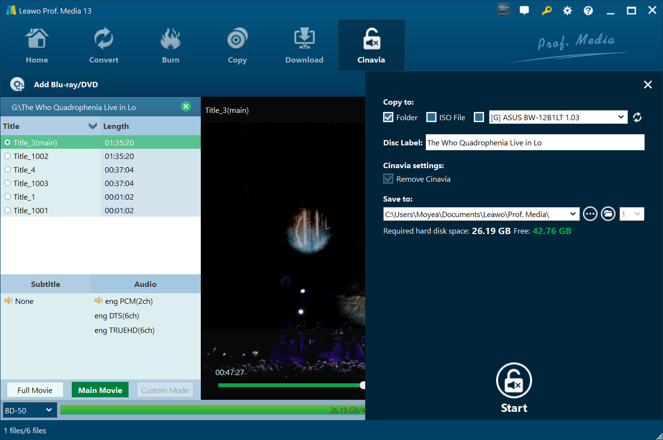 作为专业的 Cinavia 删除工具, Leawo Blu-ray Cinavia Removal 可以彻底消除原始蓝光电影中的 Cinavia 水印限制,这意味着原始 Cinavia 蓝光文件的副本中没有 Cinavia 水印,因此它不会在播放过程中停止或静音。