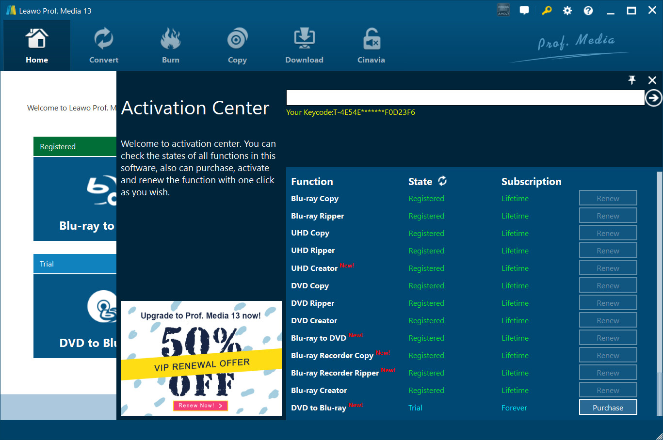 1.1. 如果您已经有注册码,只需点击右上角的注册按钮调出激活中心并在代码框中输入您的代码。如果您没有代码,请点击下面模块列表中的蓝光 Cinavia 移除购买按钮以打开购买页面 Leawo Prof. Media.
