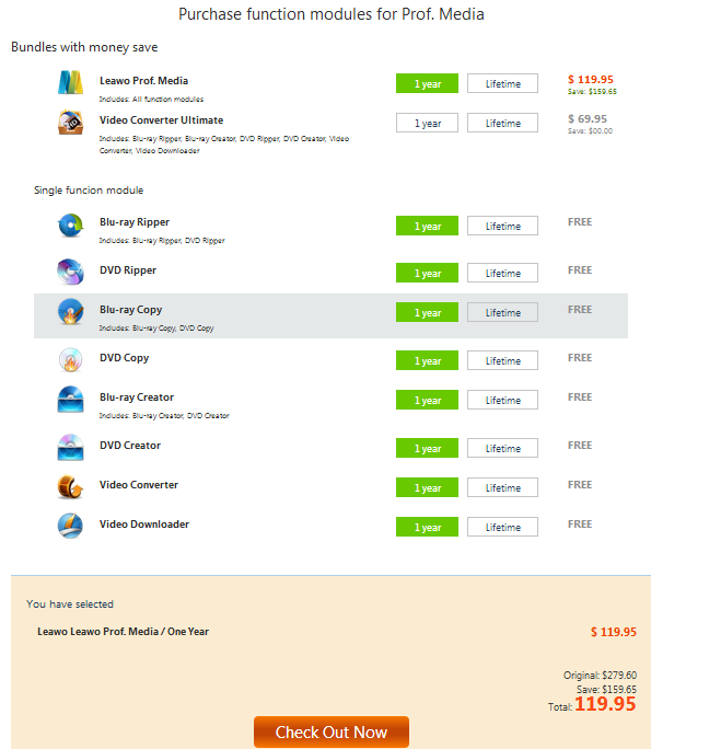 点击购买按钮,打开购买页面 Leawo Prof. Media 在您的默认 Web 浏览器上。在此页面上,您可以购买包含在 Prof. Media 或单个模块。若要购买 Cinavia 模块,只需取消其他模块的选择,并选择 1 年或终身有效期。然后将滚动条拖到页面底部,点击“立即结账”进入付款页面。