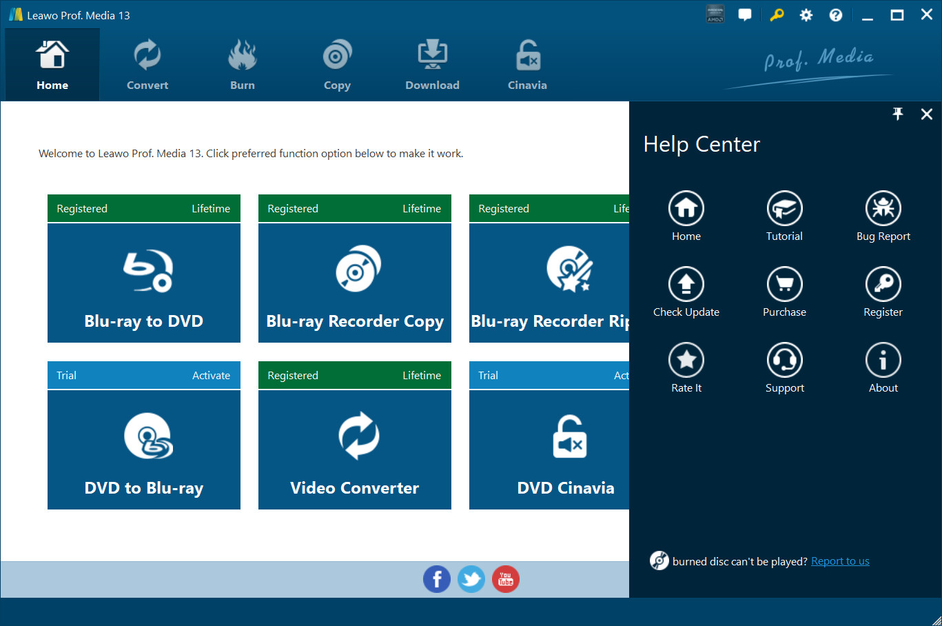 1.1 如果您已经有注册码,只需单击“注册”按钮打开激活中心并在代码框中输入您的代码。如果您没有代码,请单击下面模块列表中的 Blu-ray Creator 购买按钮,它将带您进入购买页面 Leawo Prof. Media.
