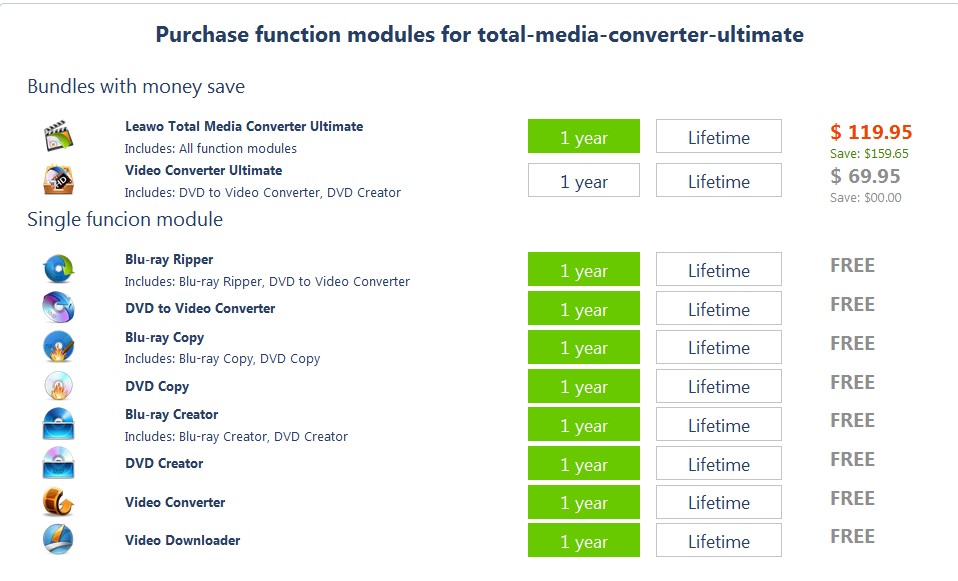 点击购买按钮后,您将进入购买页面 Leawo Prof. Media。在此页面您可以购买包含在 Prof. Media 或单个模块。要购买蓝光制作器模块,只需取消选择其他模块,并选择 1 年或终身有效(购买蓝光制作器模块时,您可以免费获得 DVD 制作器模块)。然后向下滑动到页面底部,点击 立即结账