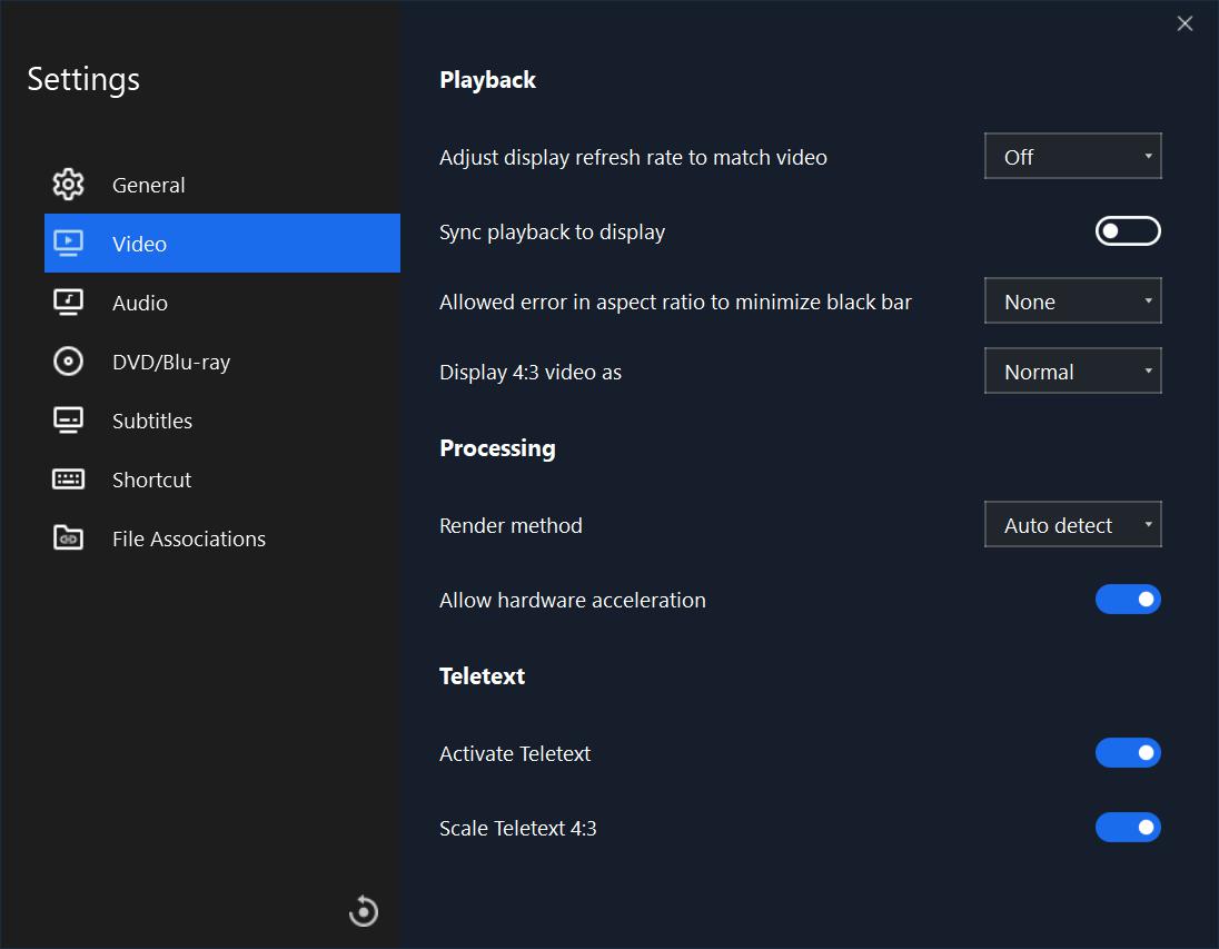 在“视频”选项卡上,您可以调整显示刷新率以匹配视频,同步播放与显示,允许宽高比误差以最大限度地减少黑边,以 4:3 格式显示视频,设置渲染方法,允许硬件加速,激活图文电视,以及将图文电视缩放为 4:3 或不缩放。