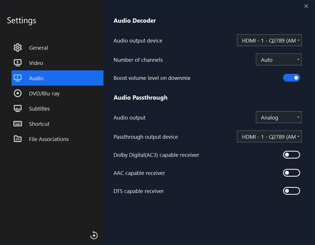 在“音频”面板中,您可以设置音频输出的不同方面,包括:音频输出设备、声道数、下混时的音量提升级别、音频输出类型、直通输出设备、支持数字(AC3)的接收器、支持 AAC 的接收器和支持 DTS 的接收器。