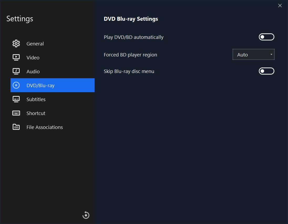 在“DVD/蓝光”选项卡上,您可以设置 DVD/蓝光播放设置,例如自动播放 DVD/BD、强制 BD 播放器区域以及跳过 DVD/BD 菜单前的介绍。