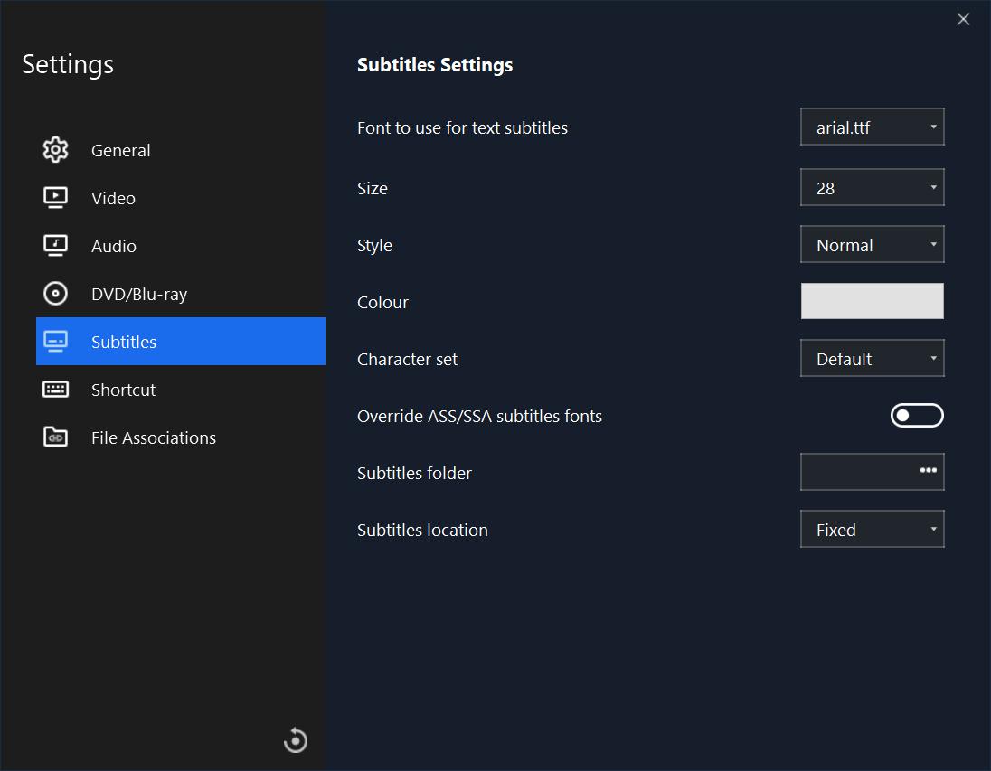 在“字幕”选项卡中,您可以设置字幕字体、大小、样式、颜色、字符集,允许覆盖 ASS/SSA 字幕字体,并确定字幕文件夹和位置。