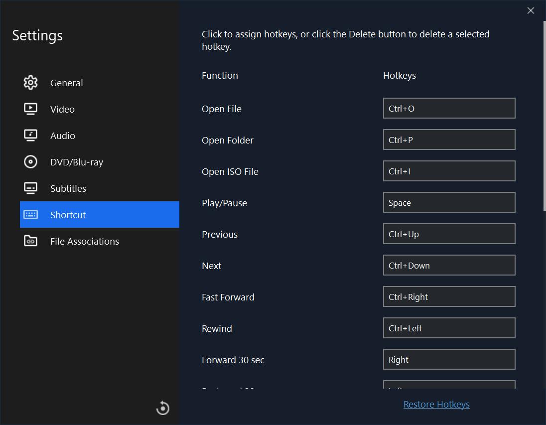 在此选项卡中,您可以单击以分配热键。如果您想重置所有热键,只需单击“恢复热键”即可。