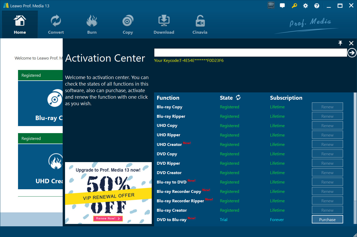 享受无限的功能 Leawo Blu-ray Ripper,您需要购买注册码才能获得注册版本。单击钥匙图标 右上角进入激活中心,点击“购买”按钮 获取注册码。收到注册码后,您需要将注册码输入框中并点击 以启动相关功能。