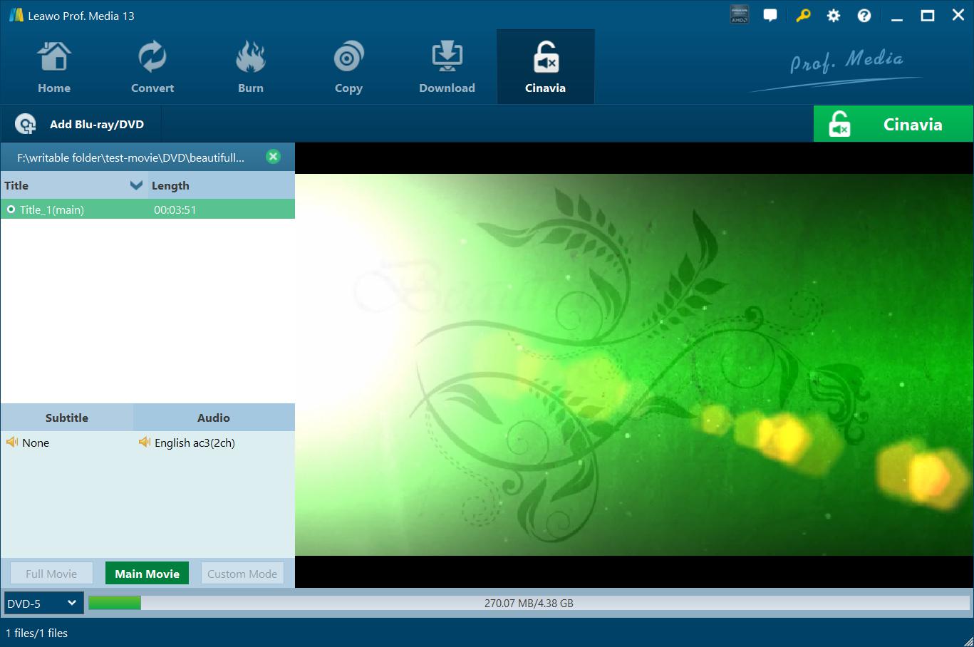 Leawo DVD Cinavia Removal 为您提供最佳解决方案,可从 DVD 光盘、文件夹和 ISO 映像文件中删除 Cinavia 水印,并将受 Cinavia 保护的 DVD 内容复制到无 Cinavia 的 DVD 光盘、文件夹和/或 ISO 映像文件。您可以根据需要在完整电影或主电影模式下复制受 Cinavia 保护的 DVD 内容。以下指南将向您展示如何使用 Leawo DVD Cinavia 移除详细信息。