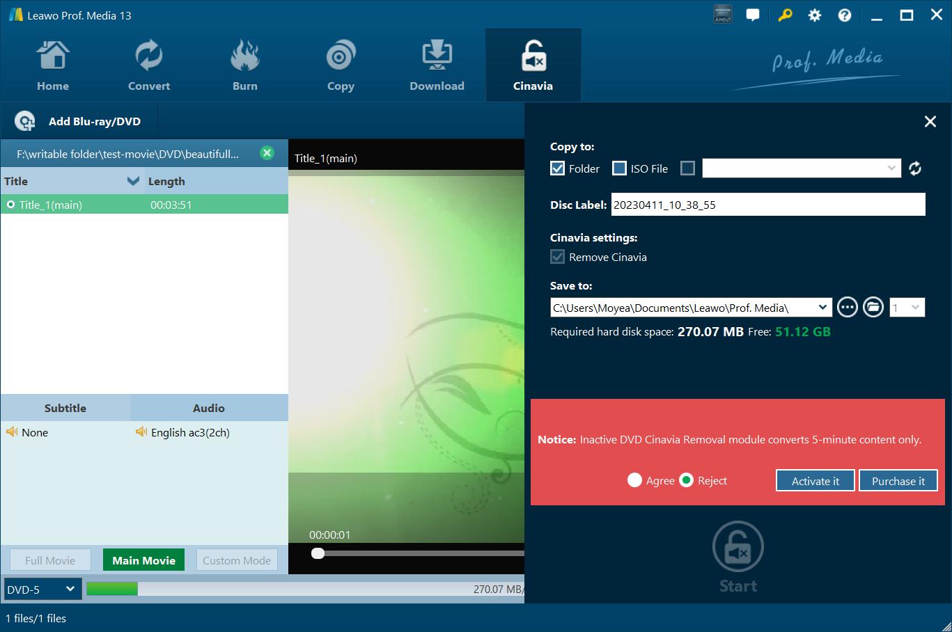 注意:如果你尚未激活 Leawo DVD Cinavia 移除模块,将出现一条通知,显示免费试用版的限制。您可以同意限制,或尝试购买许可证并激活 Leawo DVD Cinavia 删除模块。