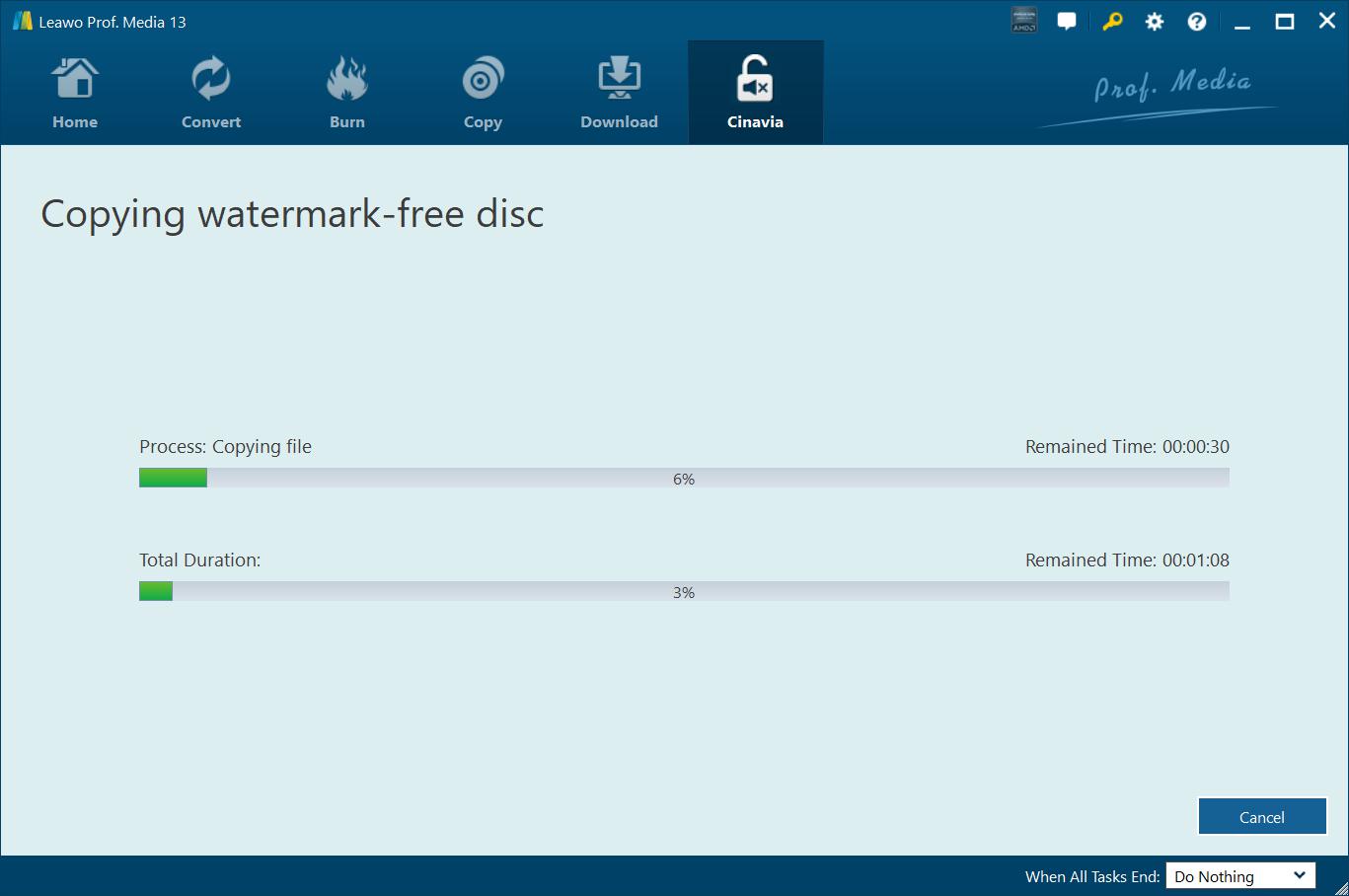 最后,点击侧边栏底部的“开始”按钮,开始复制带有 Cinavia 水印的 DVD 内容 Leawo DVD Cinavia 移除。在“复制无水印光盘”界面,您可以查看整个 DVD 复制过程,并在右下角设置完成后的操作。