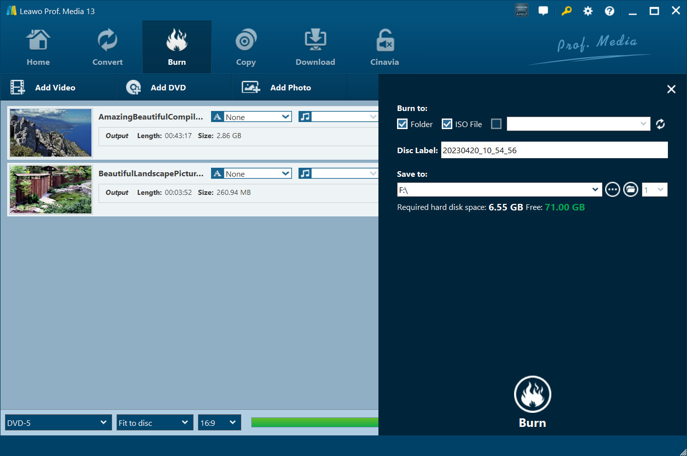 点击 烧伤 侧边栏底部的按钮开始将视频刻录到空白光盘。