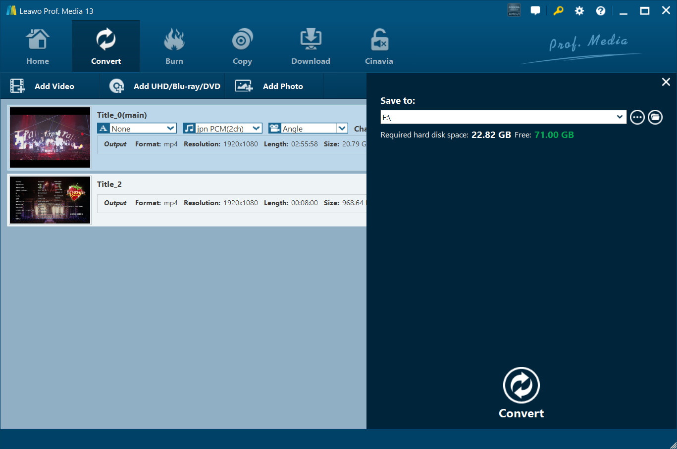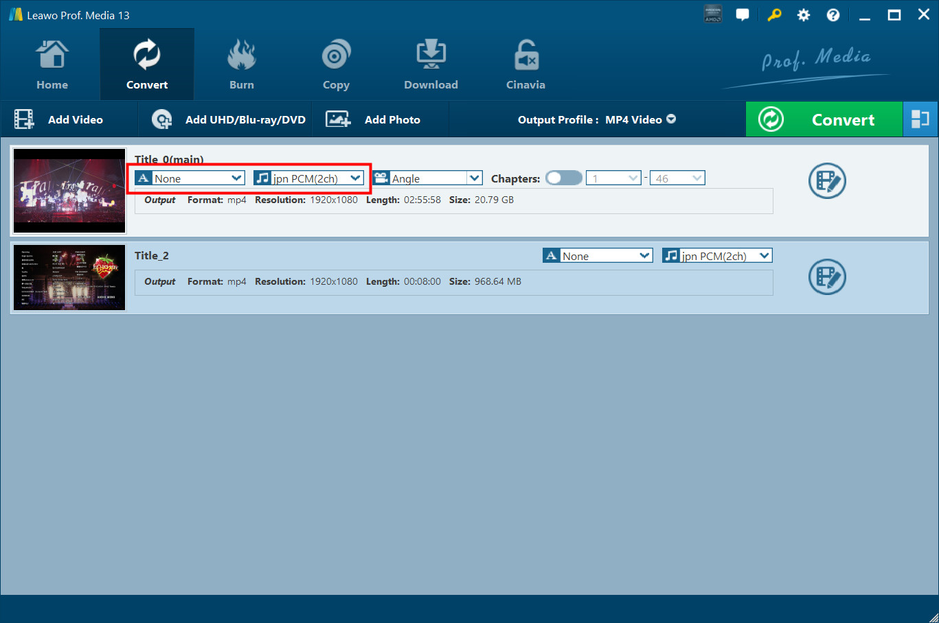 开始 Leawo Prof. Media (DVD Ripper 是 Prof. Media)进入主页,点击子菜单上的“转换”按钮或中间的“DVD Ripper”按钮进入“转换”界面。