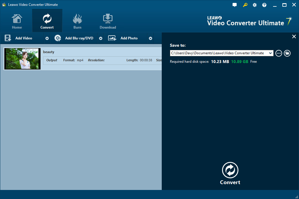 点击绿色的“转换”按钮。在弹出的侧边栏上,点击“保存到”框来设置输出目录。然后点击“转换”按钮。 Leawo Video Converter Ultimate 将立即开始制作带有音乐的幻灯片。