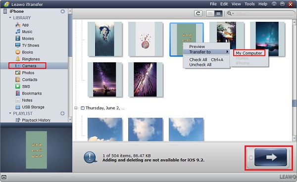 步骤3. 选择某些照片,然后单击界面右下角的传输按钮,将照片从iPhone传输到计算机。或者您可以右键单击要传输的照片,然后选择“传输到>我的电脑”。