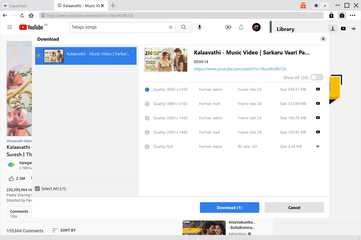 检测到文件后,会弹出一个可下载的视频和音频列表。您可以根据列出的质量、格式和大小选择所需的选项。最后,点击“下载”按钮,即可将 MKV 格式的印地语电影和歌曲视频下载到您的电脑。