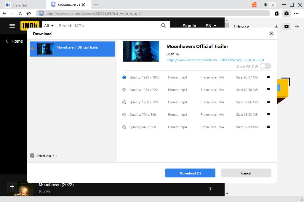 解析后,所有可下载的视频将以不同的参数在弹出窗口中列出。您可以选择任意一个或多个,然后单击蓝色的“下载”按钮,开始为您的家庭电影投影仪下载电影。