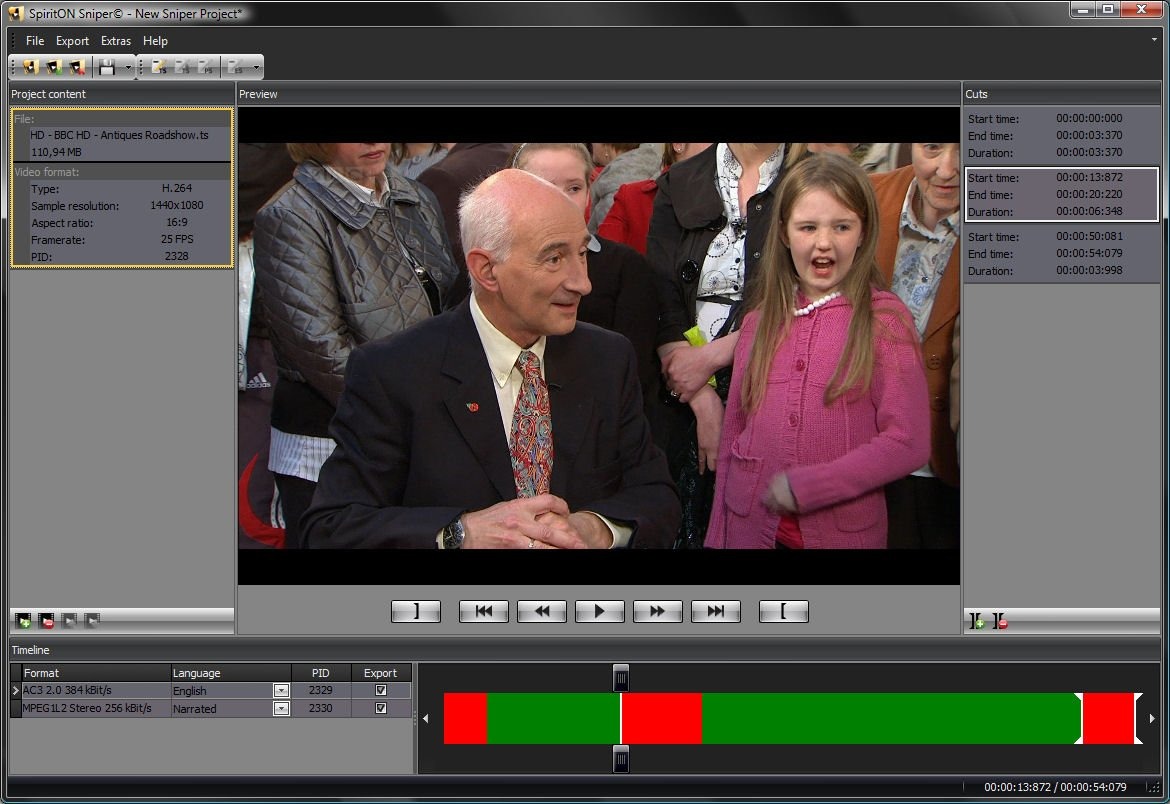 剪切无损并保存。快速完成。原始文件无需任何编辑,感觉就像剪切指定部分的文件是全新输出并保存的。当然,您也可以使用 TSSniper 以其他方式编辑蓝光 M2TS 视频文件。
