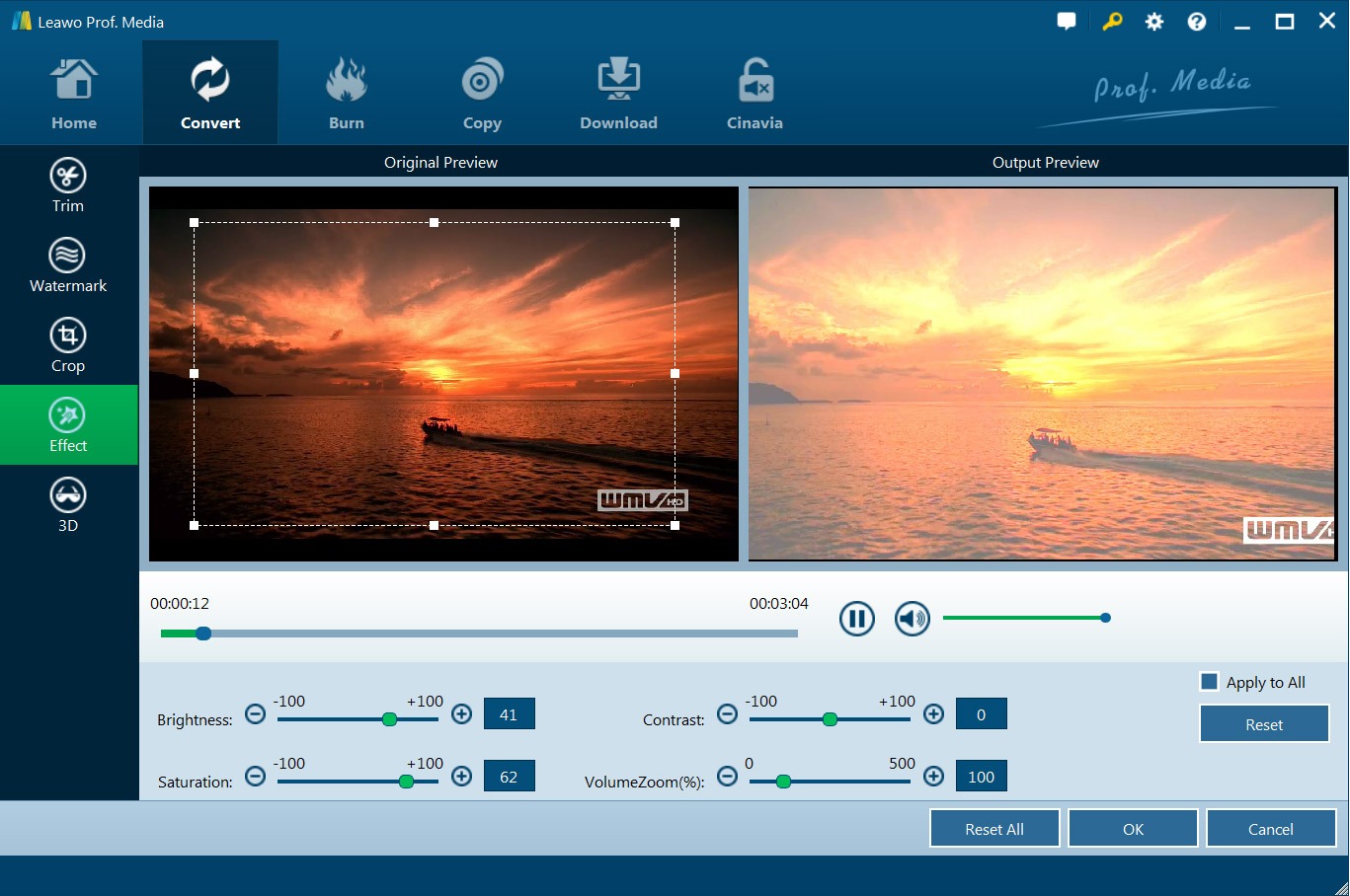 转到“效果”部分,直接拖动“亮度”、“对比度”、“饱和度”和“音量缩放(%)”的幻灯片以获得特殊视频效果。选中“应用于全部”可将效果设置应用于任何加载的文件。按“确定”确认。