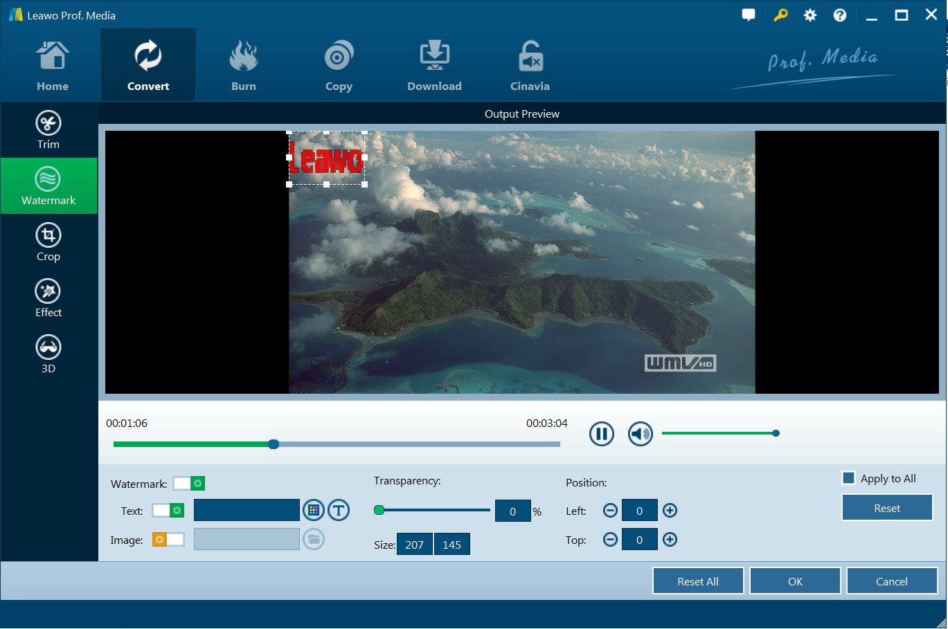 更重要的是, Leawo 蓝光播放器让您 编辑蓝光 M2TS 电影 以各种方式,如修剪视频长度,裁剪视频大小,添加图像或文字水印,调整视频效果, 将 2D 蓝光转换为 3D 电影、将 M2TS 文件合并为一个等。它可以帮助您轻松地从蓝光光盘、文件夹和 ISO 映像文件中编辑 M2TS 视频文件。