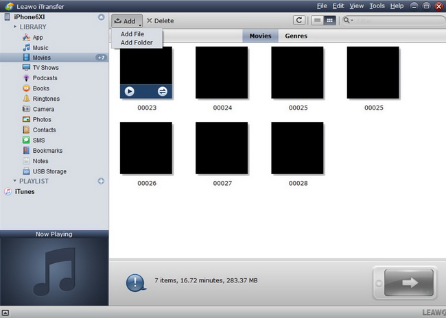 如果你想利用 Leawo iTransfer 至 将文件从 PC 复制到 iPhone例如,在窗口左侧栏中点击“iPhone 图标 > 库 > 电影”选项卡。iPhone 上的电影文件将显示在屏幕右侧。如果您想将其他文件从电脑导入 iPhone,请点击所需的选项卡。点击“文件 > 添加”按钮,然后点击“添加文件”或“添加文件夹”,浏览电脑,将电影文件从电脑导入 iPhone。