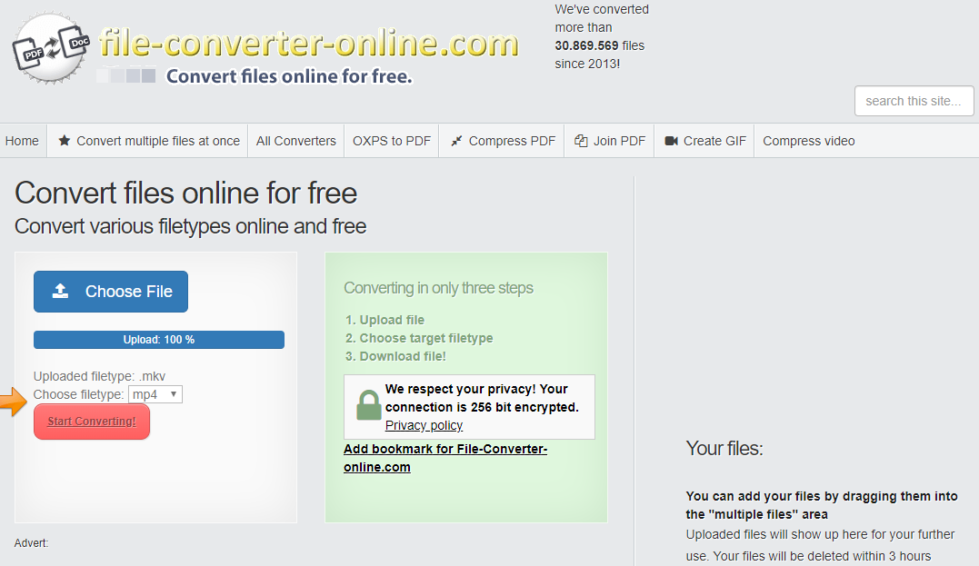 人们对在线文件转换工具最担心的问题之一就是安全和隐私问题。如果您对在线文件转换器存在安全或隐私方面的担忧,不妨考虑使用在线文件转换器 (File Converter Online) 来转换 QT 视频文件。当您连接到在线文件转换器并上传视频时,您的连接将经过 256 位加密,因此除您本人外,其他任何人都无法访问您上传和转换后的文件。此外,在线文件转换器还拥有强大的文件转换功能,可以快速转换视频、音频、Office 文档、PDF 等多种文件。因此,对于非常重视隐私的人来说,在线文件转换器是最好的在线视频转换工具之一。以下是使用在线文件转换器在线转换 QT 视频文件的方法。