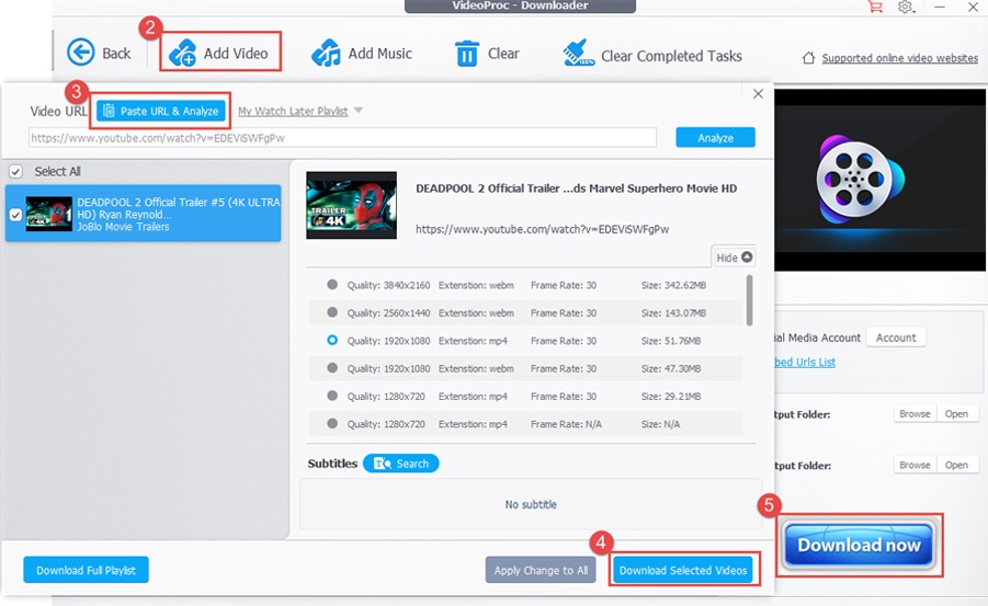 程序完成分析后,将弹出一个“下载”界面,其中提供目标视频的所有可用视频和音频下载选项供您选择。然后,您需要根据视频质量、分辨率、格式、大小和帧速率选择适当的下载选项。然后点击“下载”按钮。