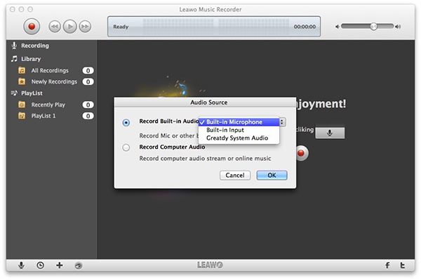 发射后 Leawo 在 Mac 上的音乐录音机中,点击主界面上的麦克风图标,选择“录制电脑音频”作为录音的音频源。