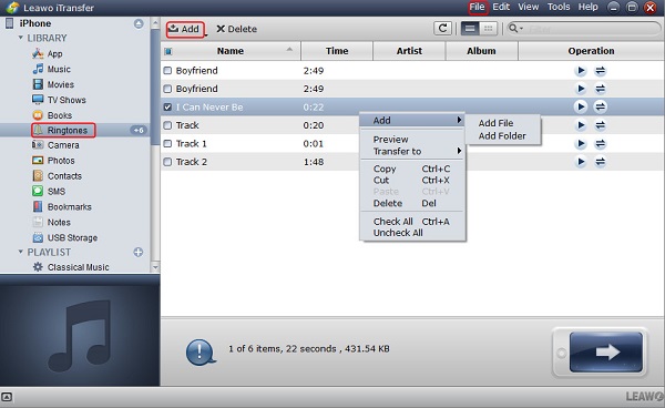 有没有更简单的方法将铃声传输到 iPhone 8? 是的, Leawo iTransfer 是一款易于使用的软件,能够在计算机、iPhone 8 和 iTunes 之间传输一系列文件,如铃声、照片、电影、电视节目、联系人等。它可以无限制地传输已购买和未购买的商品。此外,您还可以将 iPhone 文件备份到计算机和 iTunes,以避免数据意外丢失。 Leawo iTransfer 还允许您直接删除 iPhone 上不需要的歌曲或联系人。享受用户友好且现代化的界面,您可以轻松学习如何使用它。现在让我们看看如何使用 Leawo iTransfer.