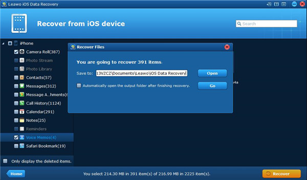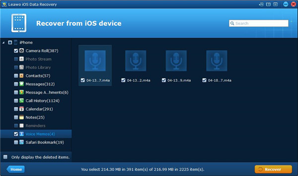 3. 你的 iPhone 将被扫描 Leawo iOS 数据恢复。扫描完成后,您将看到软件窗口左侧栏中列出了来自 iPhone 的多种数据。选中语音备忘录旁边的方框,其具体内容将显示在窗口右侧。选择您想要备份到计算机的语音备忘录。然后单击右下角的“恢复”按钮。