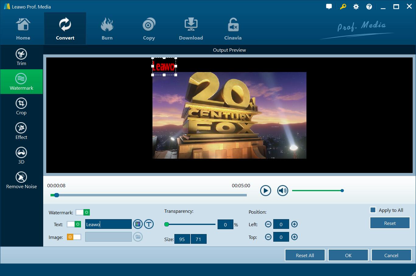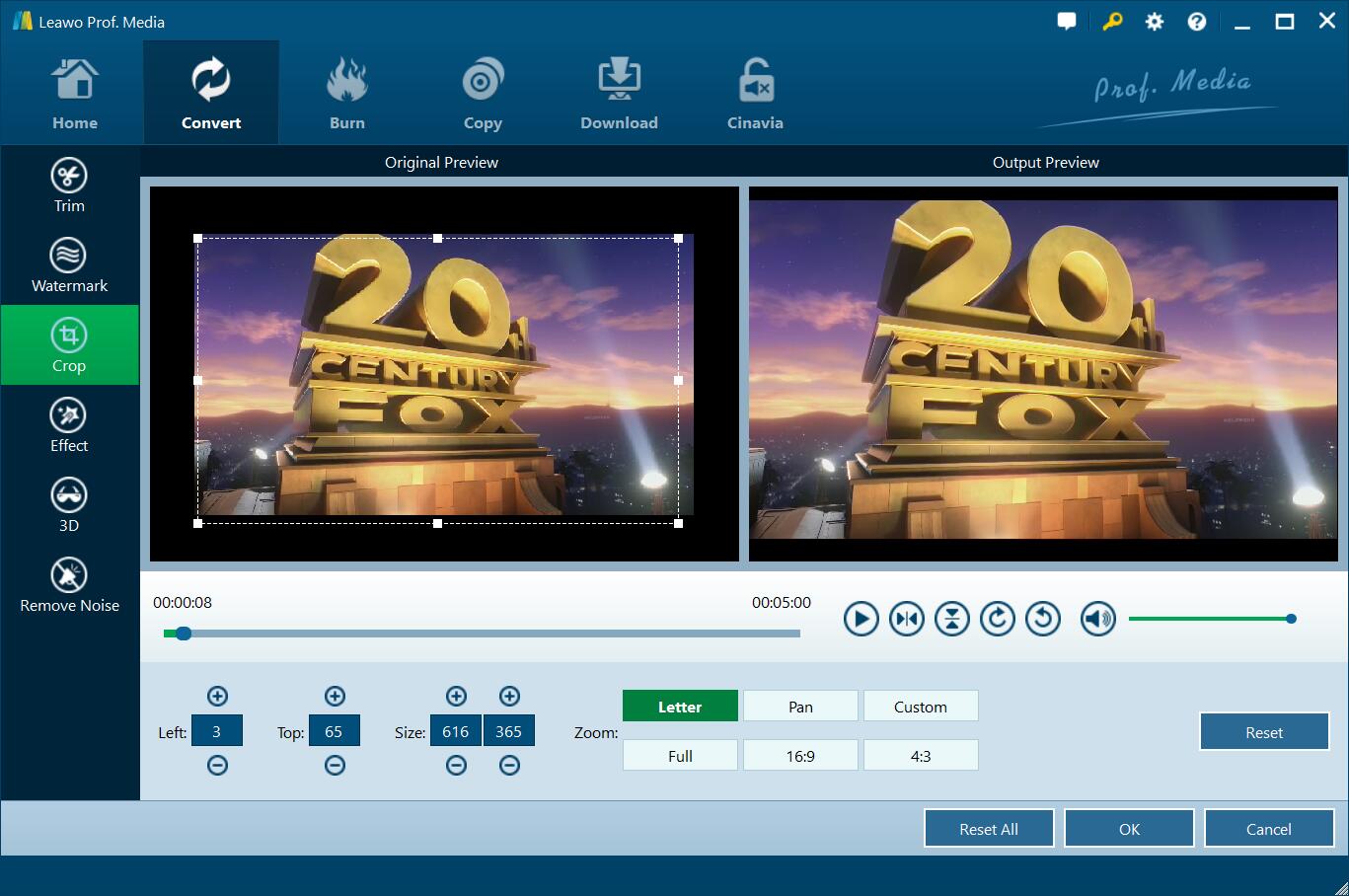 Leawo Prof. Media 包括多个有用的转换工具,包括: Blu-ray Ripper、DVD 翻录器、 蓝光复制、DVD 复制、 蓝光刻录、DVD 制作器、 视频转换和 视频下载器。 除了在蓝光、DVD、视频、音频和在线视频之间转换媒体文件的主要功能外, Leawo Prof. Media 还提供了一个内部视频编辑器,使您可以编辑 GoPro 相机录制的视频,无论您要 转换 GoPro 相机视频 转换为其他格式,或 将 GoPro 视频刻录到蓝光/DVD 内容。内部媒体编辑器可让您修剪视频长度、裁剪视频大小、添加图像或文本水印、旋转视频、调整视频效果、应用 3D 效果并消除噪音。