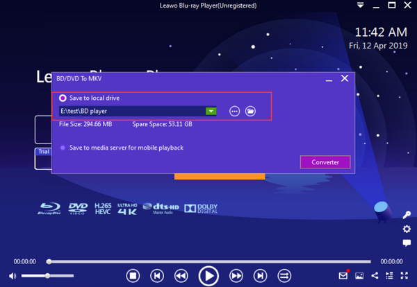 步骤3: 当源 3D 蓝光 ISO 文件已导入 Leawo 蓝光播放器会弹出一个转换对话框,让您设置输出路径以保存输出的 MKV 文件。输出文件保存路径有两种。您可以勾选“保存到本地驱动器”选项,然后点击“…”按钮,将输出文件保存到本地驱动器,然后点击“转换器”按钮开始转换。