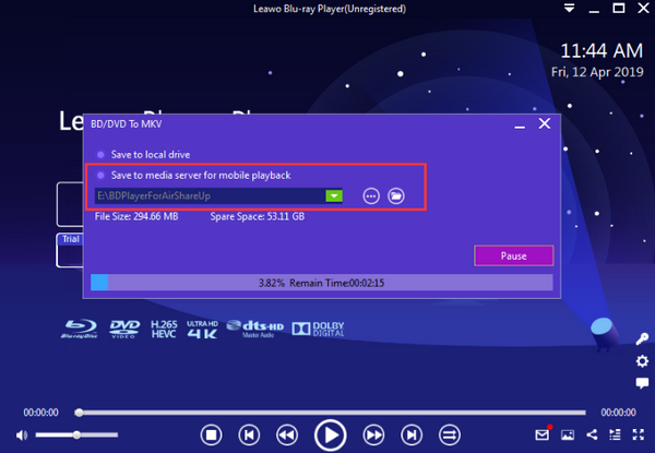 您还可以勾选“保存到媒体服务器以便移动播放”选项,将转换后的文件保存到媒体服务器,然后在下方框中设置目标位置,然后点击转换器按钮。转换过程中,您可以随时暂停或取消转换过程。转换完成后,您可以在指定的目标位置找到您的 MKV 文件。