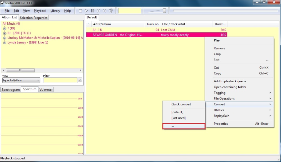 步骤1: 启动 Foobar2000。要导入源 AIFF 文件,只需将要转换的 AIFF 文件拖到播放列表中即可。文件导入后,右键单击该文件,然后将鼠标悬停在“转换”>“…”上,单击以进入转换器设置。