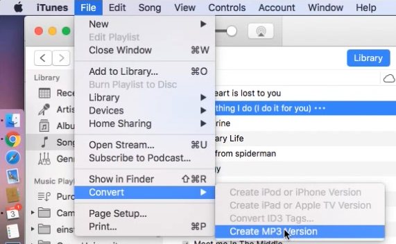 步骤2: 找到 AIFF 文件后,请确保您要转换的文件是…… MP3 选中并高亮显示。点击“文件”,然后找到“转换”。在子菜单中,选择“创建”。 MP3 版本”。