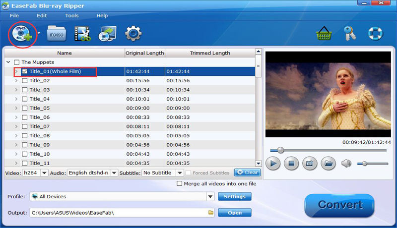 - 加载源蓝光电影后,您可以选择字幕和音轨、标题。