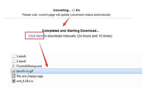 - 4. 文件加载完成后,会出现一个新页面,显示转换进度。请等待转换完成。最后,在线转换器将自动开始将转换后的 GIF 文件下载到您的电脑文件夹中。您也可以点击“点击这里“手动下载转换后的 GIF。