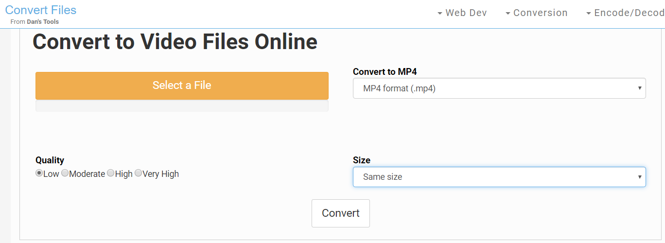 此外,Files-Conversion 也是一款出色的在线视频转换器,可以将 TP 视频转换为 MP4。它提供免费的在线服务,可将任何格式转换为 MP4、AVI、FLV 和其他常见视频格式。您还可以设置输出质量和合适的大小。在这里,您只需几个简单的步骤即可将 TP 视频文件转换为 MP4。