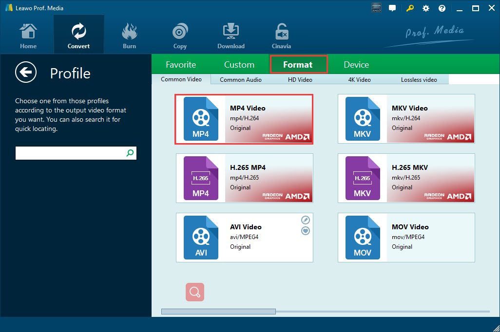 打开绿色大“转换”按钮之前的视频格式按钮,调出一个下拉框,您可以单击“更改”按钮进入“配置文件”面板,然后从“格式”组中选择 MP4 作为输出格式。