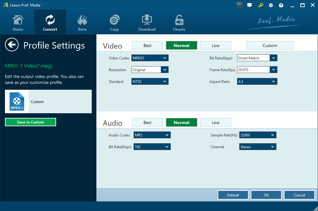 注意:您也可以点击“编辑”按钮进入“配置文件设置”来设置视频和音频参数,包括视频编解码器、分辨率、比特率、音频编解码器、采样率等。