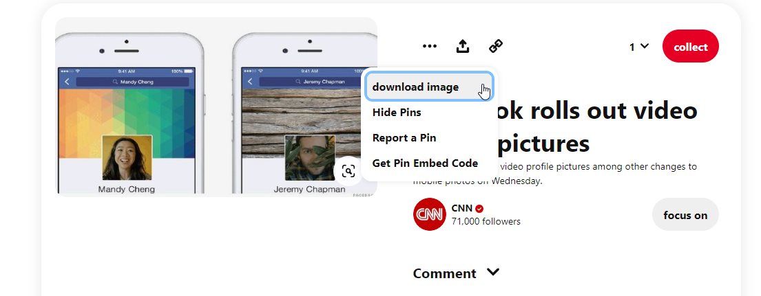 - 根据我的测试,Pinterest 的确提供了保存图片的功能。点击一个 Pin 图,然后点击图片旁边的三点图标,就会出现“下载图片”选项。点击此按钮即可轻松保存 Pinterest 上的图片!