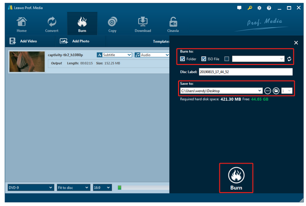 点击 烧伤 调出侧边栏,向您显示指定刻录类型和保存到的目录。