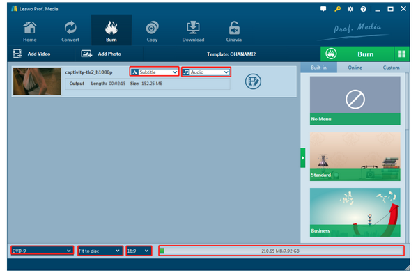 成功导入源视频后,窗口底部会出现一个窗口,让您指定光盘类型和宽高比。根据实际情况选择光盘类型和宽高比。然后您可能会注意到右侧窗格中将显示菜单模板,这些模板都可供您选择。您也可以通过单击 字幕 区。