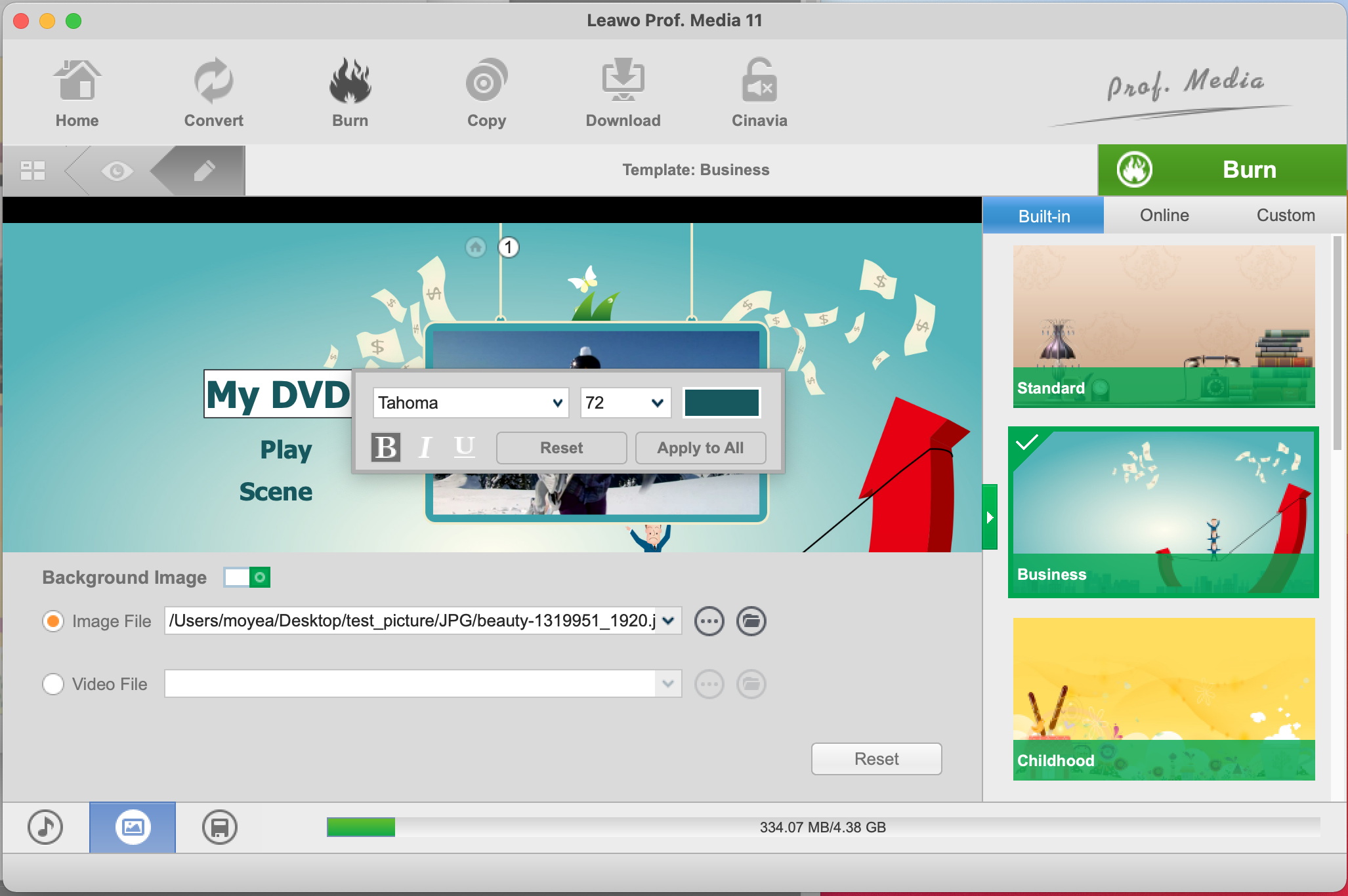 在右侧边栏,您可以选择输出DVD的菜单。点击菜单中间部分,即可预览菜单。在预览面板中,点击铅笔图标,即可对菜单进行各种设计,例如添加背景图片/视频/音乐,调整标题内容、颜色、大小、字体等等。