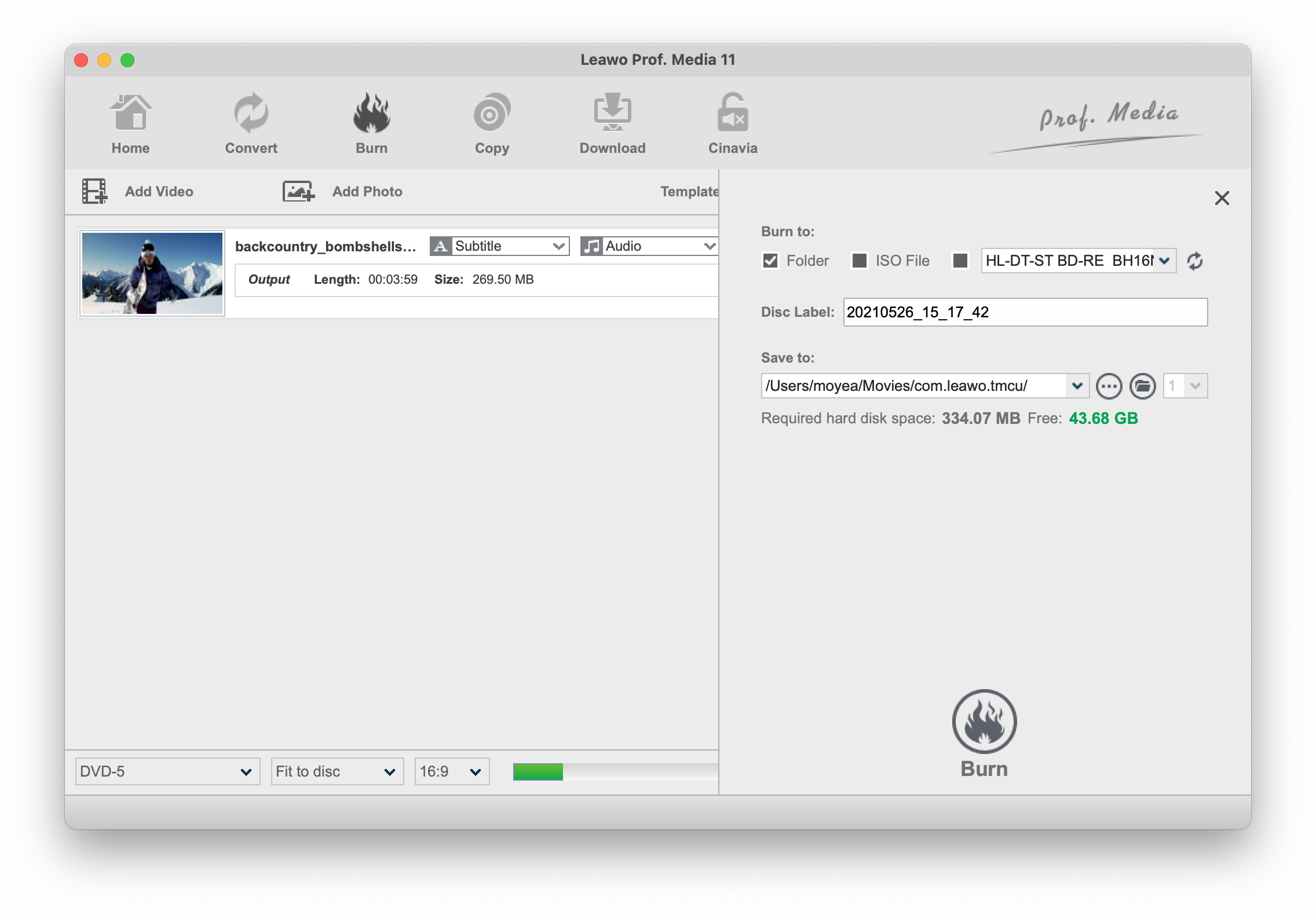 点击绿色的“刻录”按钮。在弹出的侧边栏中,完成更多刻录设置,包括“刻录到”、“光盘标签”和“保存到”选项。“刻录到”选项允许多选。要将 iTunes 电影刻录到 DVD 光盘,请将一张空白可刻录 DVD 光盘插入连接到电脑的 DVD 光驱,然后在“刻录到”选项中选择该光盘作为输出。
