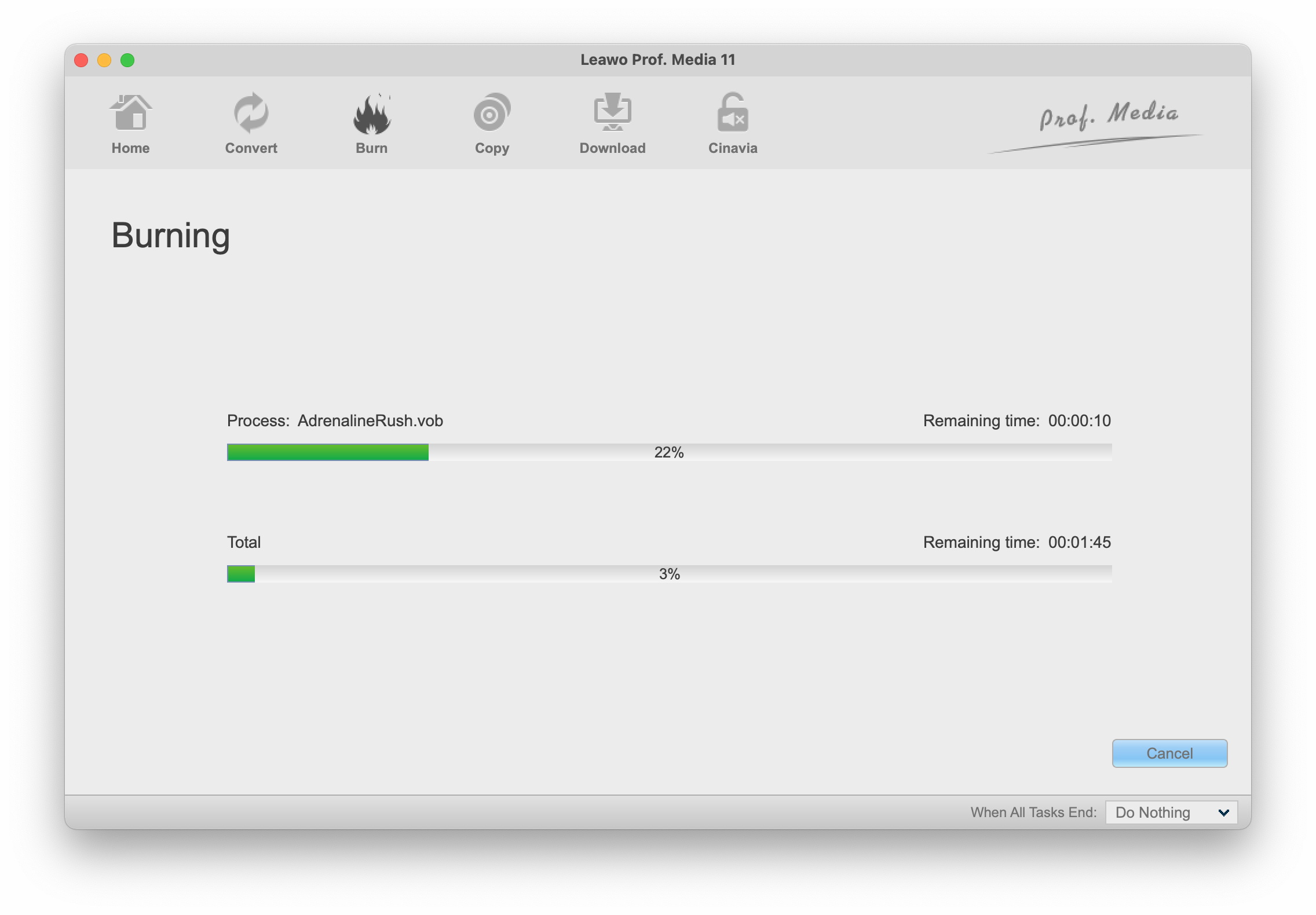 之后,点击底部的“刻录”按钮,即可开始将转换后的 iTunes 电影刻录到 DVD。 Leawo DVD刻录机。然后,您可以查看将iTunes电影刻录到DVD的整个过程。