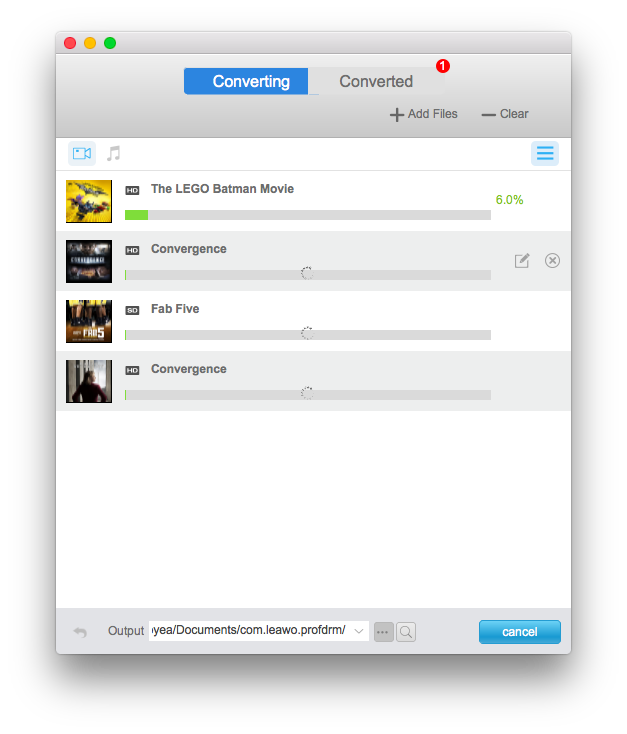 安装后 Leawo Prof. DRM 在 Mac 电脑上,启动程序并进入主界面。您可以直接将目标 iTunes 视频文件拖放到程序中。或者,点击“添加文件”按钮,然后点击“视频”标题下的“添加”按钮,将 iTunes 影片同步到程序中。选择要转换的视频后,点击底部的“添加”按钮导入文件。
