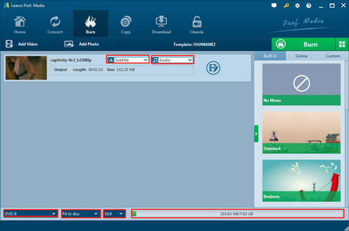 查看界面底部,正确设置DVD光盘类型。可调节的设置包括DVD质量、视频比例、字幕和背景音乐。