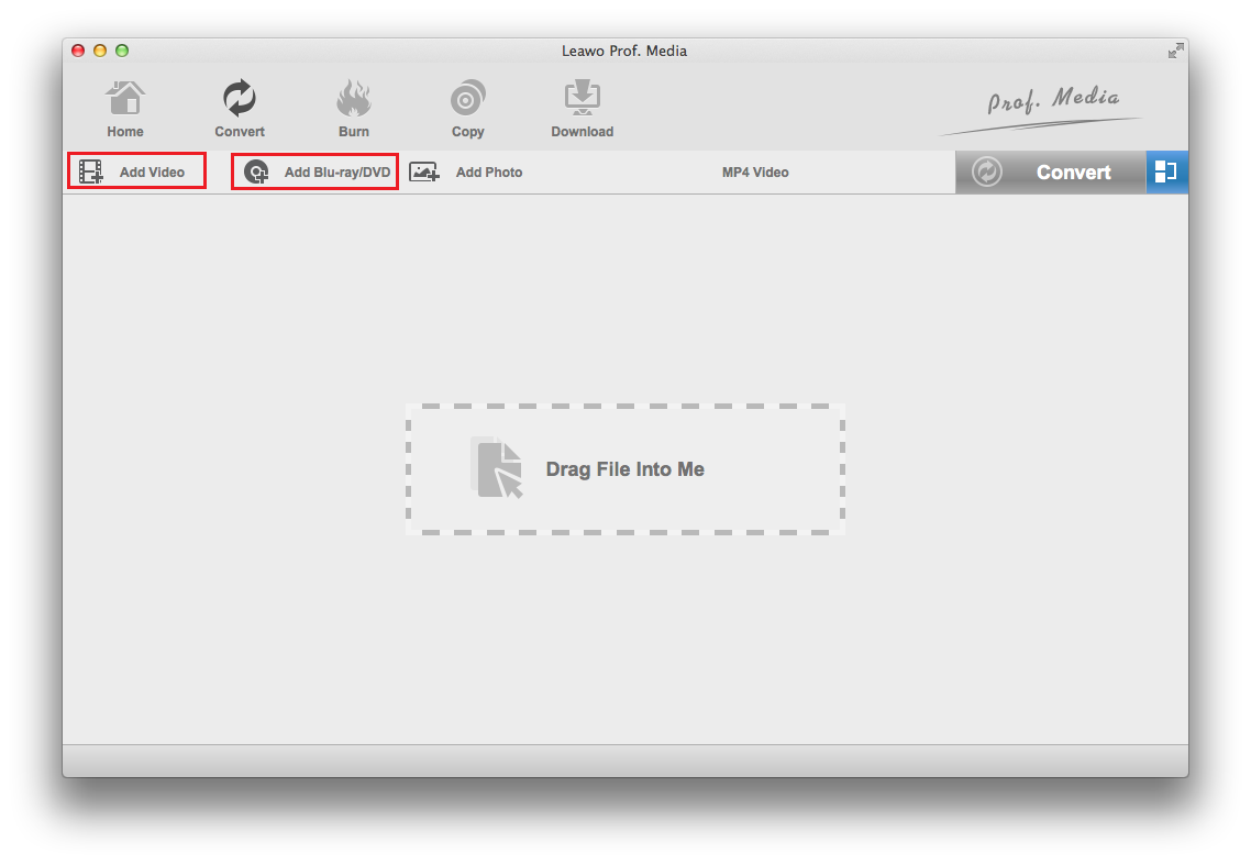 开始 Leawo Prof. Media 然后打开“转换”模块。您可以看到“添加视频”和“添加蓝光/DVD”按钮。根据您的需要添加源媒体文件。
