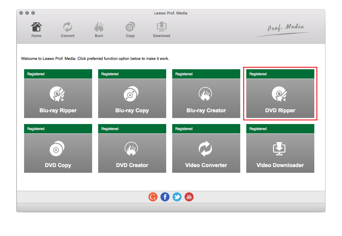 正式上线 Leawo Prof. Media 在您的MacBook上。然后点击菜单栏上的“蓝光/DVD翻录器”选项或“转换”选项,进入DVD翻录器模块。